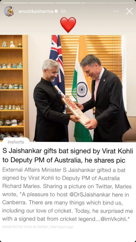 The actress shared a photo of a news article with a heart emoji. For the unversed, External Affairs Minister S Jaishankar met Australian Deputy Prime Minister Richard Marles in Canberra on Monday and gifted a signed bat from Virat Kohli, in a special gesture to show the common thread of cricket that binds both countries together.