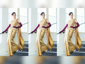 Kangana Ranaut's first look from Cannes Film Festival 2019 is out and it has left us all speechless. In the latest photo instagrammed by the actress' team, the 'Queen' is seen posing in a golden Kanjeevaram saree by Falguni Shane Peacock. She wore it over an embellished off-shoulder corset blouse. We especially loved how her stylist Ami Patel gave a vintage twist to the whole look with her wavy hairstyle, the mid-arm burgandy gloves and the exagerrated corset belt.