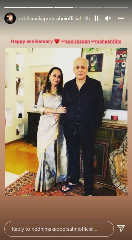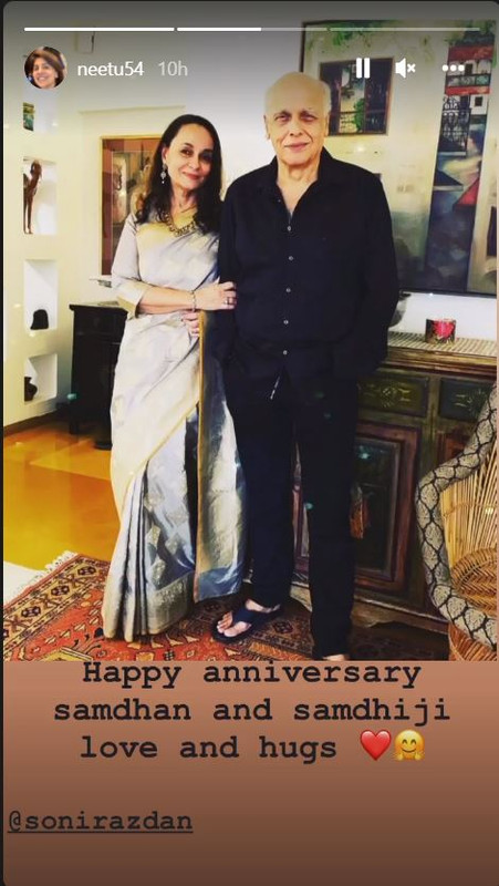 Taking to her Instagram Story, Neetu shared a picture of her daughter-in-law Alia Bhatt's parents and wrote, "Happy anniversary samdhan and samdhi ji, love and hugs."