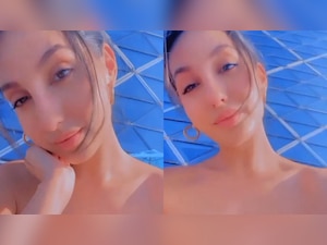 In a new viral video, Nora Fatehi can be seen shooting a selfie video while wearing a bright blue bikini top.