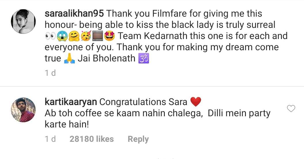 On Saturday, Sara won the Best Debutante Award for her first Bollywood film, Kedarnath. The pretty lady took to her Instagram page and shared a series of photos holding her trophy. She captioned her post as, "Thank you Filmfare for giving me this honour- being able to kiss the black lady is truly surreal Team Kedarnath this one is for each and everyone of you. Thank you for making my dream come true Jai Bholenath"