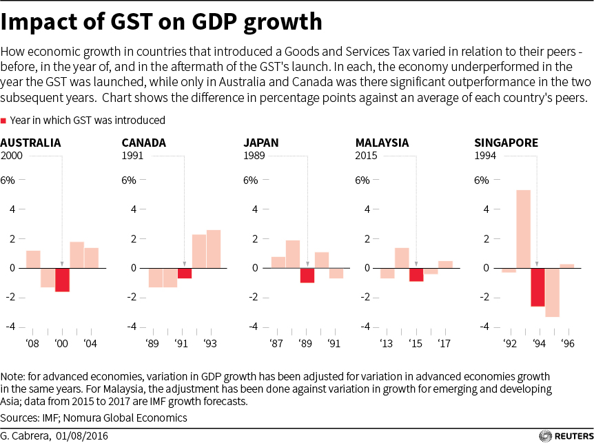 Countries that have introduced GST in the past have often faced a relative economic slowdown before the benefits of a unified tax regime feed through.