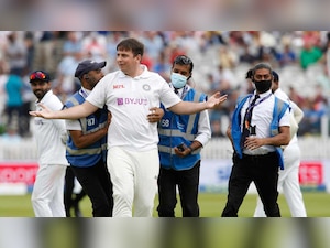 A pitch invader at Lord's Cricket Ground left the Indian cricket team in splits after he casually joined the team in the field.