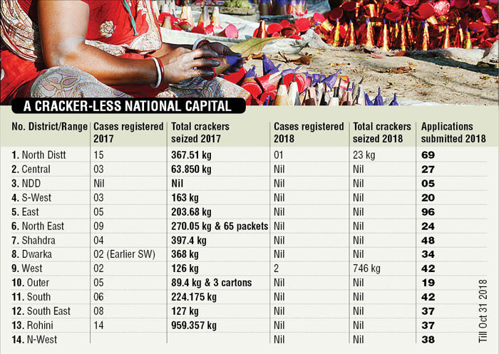 Sitting listlessly on a worn down chair is his neighbour Vishal Aggrawal who is already mulling new business avenues. “This is the third year running when it will be a black Diwali for us. Our peak profit season has been reduced to nothing. We are not against the court orders but it should have come earlier so that we didn’t buy new stock and waste more money,” a distraught Aggrawal complains. “It is darkness for us on festival of lights. A lot of my supply has gone bad and I was hoping to clear the remaining but it is a no go this year. My losses run into lakhs now,” rues Mukesh Pradhan, another cracker trader in Sadar.