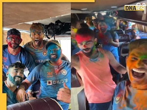 डीएनए हिंदी: Team India Celebrates Holi- ऑस्ट्रेलियाई क्रिकेट टीम के खिलाफ टेस्ट सीरीज का तीसरा टेस्ट बुरी तरह हारने के बाद भारतीय क्रिकेट टीम (Indian Cricket Tam) चौथे टेस्ट मैच के लिए अहमदाबाद पहुंच चुकी है. चौथा टेस्ट मैच 9 मार्च से शुरू होने जा रहा है, लेकिन इससे पहले आ गई है होली. अब रंगों की होली है तो उसका रंग टीम इंडिया (Team India) पर भी चढ़ना ही था. टीम इंडिया मंगलवार को होली के ही रंग में रंगी नजर आई, जिसका सबसे ज्यादा असर दिखा पूर्व भारतीय कप्तान विराट कोहली (Virat Kohli) पर. इस टेस्ट सीरीज में अब तक बल्ले से रंग में नहीं दिखाई दिए विराट कोहली मंगलवार को मस्ती के पूरे रंग में थे. होली के रंगों में सराबोर विराट ने टीम बस में ही ऐसे ठुमके लगाए, जिनका वीडियो (Virat Kohli Dance Video) सोशल मीडिया पर जमकर वायरल हो गया है. इसके अलावा भी टीम इंडिया के ज्यादातर खिलाड़ियों ने होली के 'हैप्पी मूमेंट्स' सोशल मीडिया पर शेयर किए हैं. आइए देखते हैं टीम इंडिया ने कैसी मस्ती की.