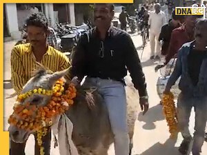 दरअसल वायरल वीडियो में एक आदमी पैंट-शर्ट पहनकर गधे पर बैठा दिख रहा है. गधे को फूल-मालाएं पहनाई गई हैं, जबकि उसके पीछे-पीछे ढोल बजाता आदमी भी चल रहा है. गधे की लगाम दो लोगों ने थामी हुई है. गधे को लेकर वे छतरपुर कलेक्टर ऑफिस की तरफ जा रहे हैं. यह वीडियो 11 मार्च का बताया जा रहा है.