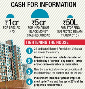 The Finance Ministry has come out with a scheme to reward the informants of benami transactions. A person giving specific information, in a prescribed manner, about a benami property will get up to Rs 1 crore while the same for undisclosed black money stashed abroad could fetch up to Rs 5 crore. The ministry has also amended the existing income tax informant reward scheme of 2007.