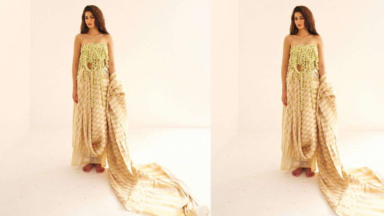 The standout feature of her look was the strapless floral blouse, which immediately captivated fans. Instead of a traditional blouse, Ananya opted for a distinctive off-shoulder design crafted from white mogra flowers.
