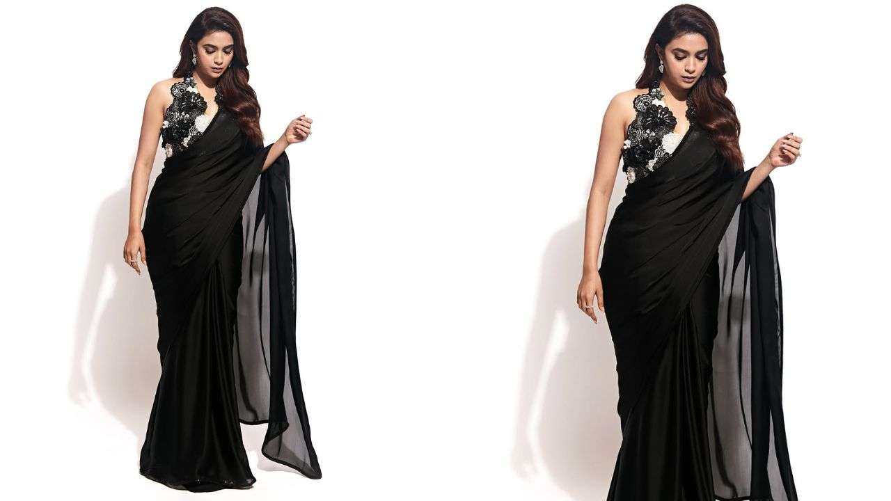 Keerthy paired her plain black chiffon saree with a sleeveless silver-embellished blouse. The blouse showcased a deep V-neckline with halter neck details and intricate black and silver floral embroidery, adding a touch of elegance to her look.
