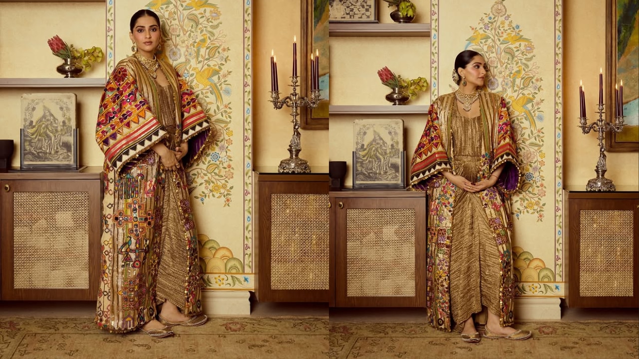 Adding contrast and drama, Sonam wears an embroidered jacket layered over the gold dress. This jacket features intricate mirrorwork, vivid geometric patterns, floral motifs, and layered thread embroidery.