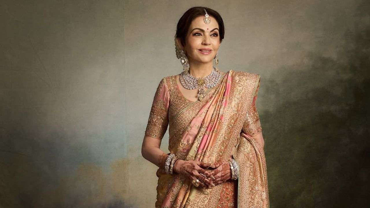 Nita Ambani is embracing a simple yet timeless makeup look that enhances her natural elegance. Her well-defined, deep brown eyebrows are framing her face beautifully. She applied eyeliner prominently to accentuate her eyes. The overall makeup is staying classic and refined, perfectly complementing her grace.