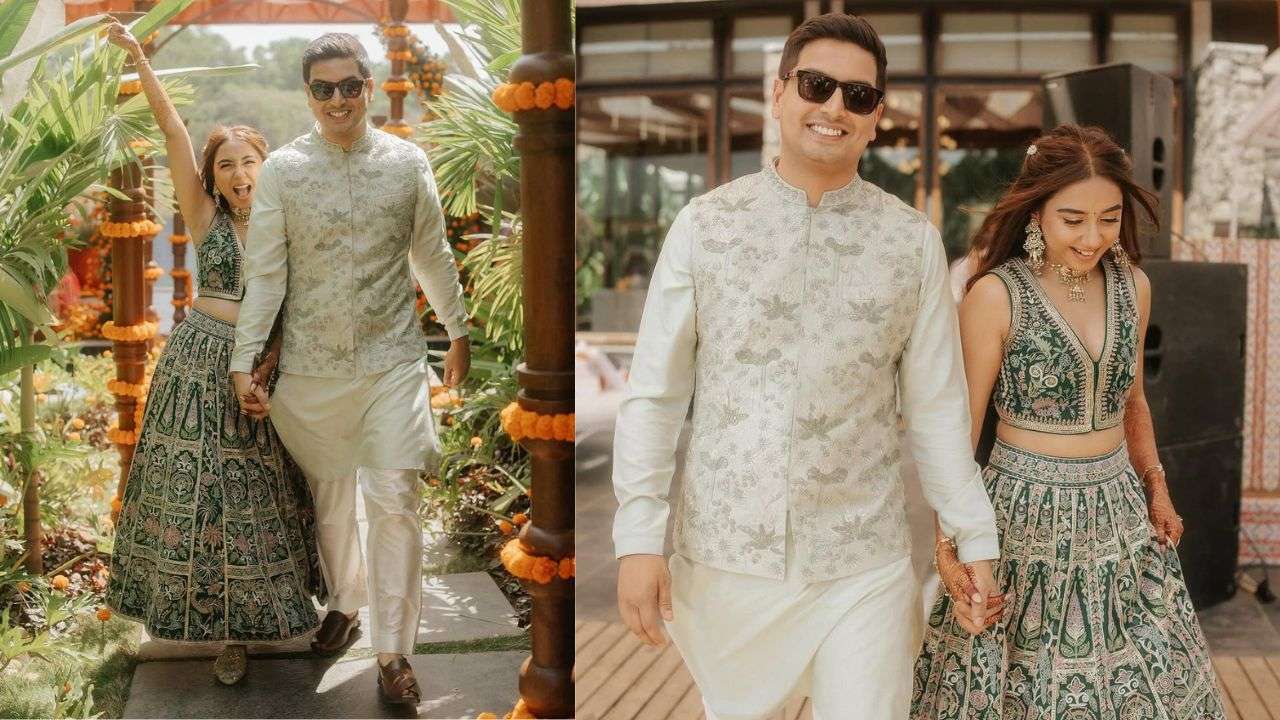 Prajakta dazzled in a dark green embroidered lehenga, exuding elegance, while Vrishank perfectly complemented her look in a mint-green kurta paired with a printed Nehru jacket.