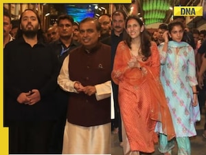 Radhika Merchant's choice for the darshan was a lesson in minimalism. She stepped out in a pastel blue cotton kurta set that featured delicate white and pink stripes, floral embroidery, and intricate gold gota work. The kurta had a tailored fit with quarter-length sleeves and side slits, which she paired with matching palazzo pants and a gota patti embroidered dupatta. Her accessories were kept minimal, with diamond earrings, a small bindi, and a half-up hairstyle. Her bare, makeup-free face added to the effortless charm of her look, proving that less is truly more.