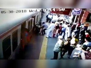 The passenger failed to board and was left out partially hanging outside from the local train. The RPF was alert enough as he pulled her out - while he too lost balance in the process - as the train was gaining speed.