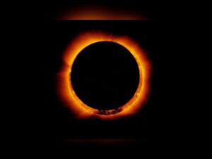 An annual solar eclipse occurs when the sun and the moon are exactly in line, but the apparent size of the moon's shadow is smaller than that of the visible disc of the sun. The covered sun, therefore, appears as a 'Ring of Fire', with its rays appearing spread out from the outline of the moon. A sight to behold, indeed!