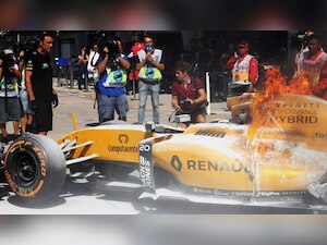 While Magnussen made it back to the safety of his garage, his car remained stranded in the pitlane as fuel gushed out of the top of the airbox repeatedly catching fire which the team's mechanics kept putting out.