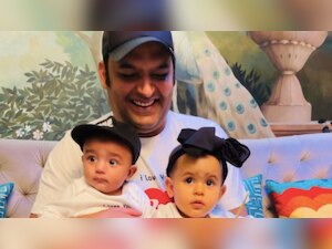 In the photo, Kapil can be seen holding Trishaan and daughter Anayra in his lap as he cuts a huge cake. Anayra looked adorable in a black bow hairband while Trishaan looked charming in a black cap. Both the siblings were twinning in white t-shirts.