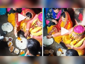 In this video that has gone viral on social media, the newlyweds can be seen performing rituals at the groom’s house. The couple in the video is seen eating sweets. A plate is placed in front of the bride and groom and the sweets kept in it, which have to be eaten by both. The bride then suddenly puts the sweets of her plate on the groom's plate. After which, the groom's puts four gulab jamun on the bride’s plate. Seeing this, family members and guests start laughing fiercely.