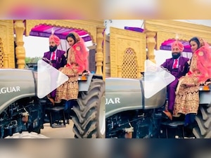 The bride accompanied the groom on the tractor, sitting on the shoulder of the farm machine, holding her groom’s left arm. She is dressed in a pink and golden lehenga and seemingly ecstatic but keeping it under the wraps. Have a look