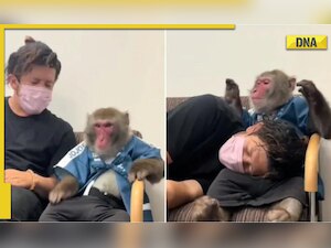 The video begins with a man sitting by a monkey clothed in a shirt and shorts. The man appeared worried, depressed, and on the verge of tears. The monkey clearly sensed it and asked the man to lie down on his lap.