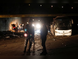 The white tourist bus could be seen with its windows shattered and surrounded by soot-covered debris.