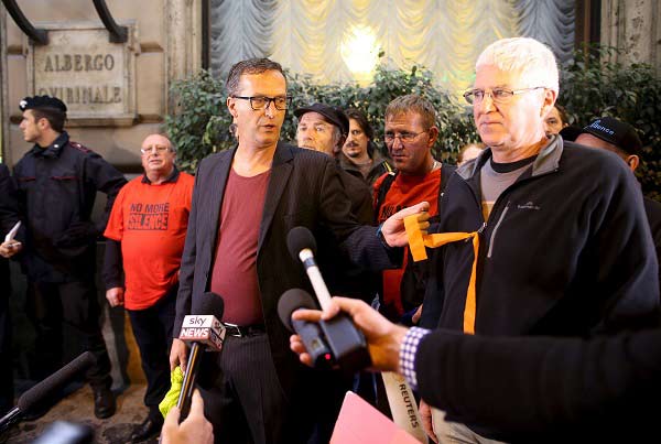 David Ridsdale (L), a child sex abuse victim, shows a yellow ribbon as he speaks with media in front of the Quirinale hotel in Rome, Italy, February 28, 2016.Image Credit: Reuters
